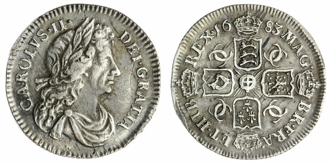 The Frank Viles Collection of Sixpences | Charles II (1660-1685), Sixpence, 1683, rev. three strings to harp (Spink 3382; ESC 580 [1523]; Pywell-Phillips 84), scratches and flecking and once cleaned, otherwise very fine