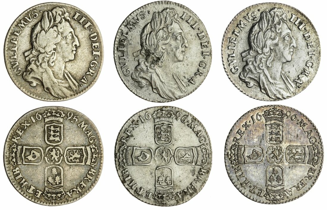 The Frank Viles Collection of Sixpences | William III (1694-1702), Sixpences, London (3), 1695, first bust, large crowns (Spink 3520; ESC 1201 [1532]), fine; also, 1696 (2), first bust, large crowns (Spink 3520; ESC 1202 [1533]), the second heavily cleaned with surface marks, a bolder very fine, the first good fine, the third lightly cleaned, otherwise toned, a bold very fine (3)