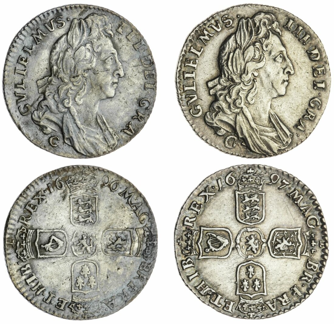 The Frank Viles Collection of Sixpences | William III (1694-1702), Sixpences, Chester (2) 1696, first bust, early harp, large crowns (Spink 3522; ESC 1268 [1536]), cleaned, about very fine; another, 1697, first bust, rev. no stops after MAG, FRA or HIB, small crowns, late harp (Spink 3533; ESC 1273 [1557A]), polished a really bold very fine, rare (2)