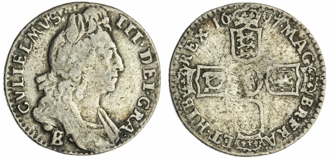 The Frank Viles Collection of Sixpences | William III (1694-1702), Sixpence, 1697, Bristol, struck with a York obverse die [?], first bust, B over y [?], rev. 'small' crowned shields cruciform, five strings to late harp, edge obliquely milled, 6h (Spink 3532; cf. ESC 1263 [1555A]), good to fair, the overpunching clear and different to the known 'B over E' varieties, unlisted, very rare thus