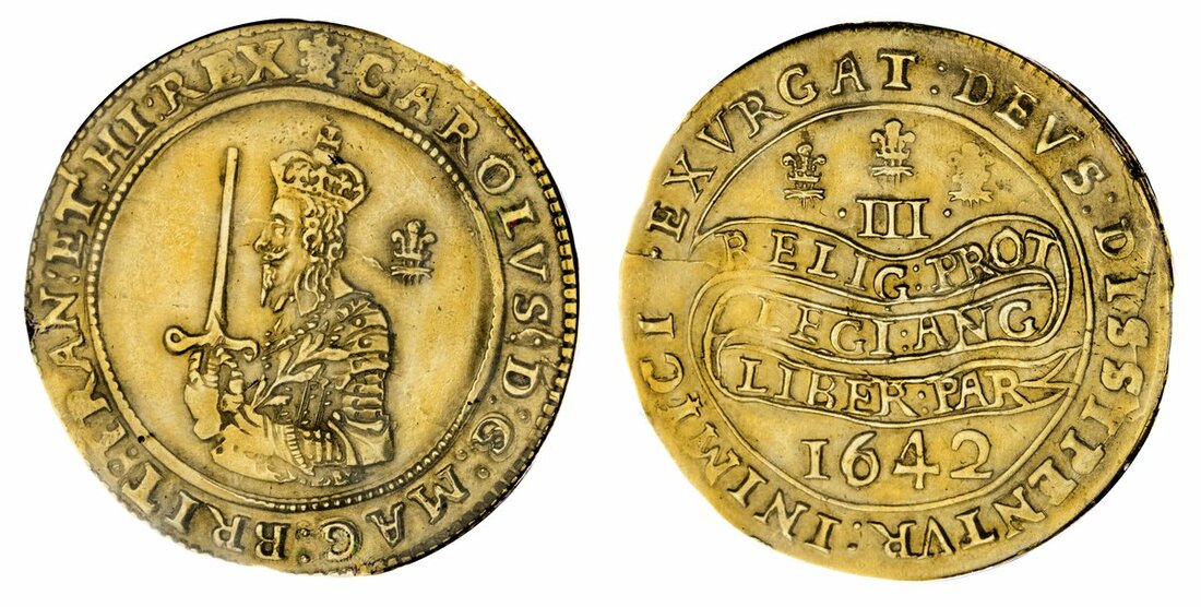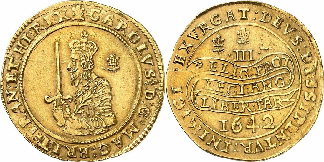 (x) Charles I (1625-1649), Oxford Triple-Unite, 1642, Civil War Issues, ‘Declaration’ type, by ‘London’ die cutters, struck 3 January - 24 March 1642 at New Inn Hall, half-length figure of cuirassed King in profile left, holding sword and laurel branch, Oxford plume behind, rev. ‘Wellington’ Declaration, reading LEGI on continuous scroll of three lines, III and three even plumes above, date below, 26.72g, 8h, m.m. plume/- (Spink 2724; North 2382; Brooker 834 this coin; Schneider II, 286-89/297 same dies; Durlacher 279 same dies; Nelson II; Morrieson B-4; Beresford-Jones, dies III/L1), an exceptionally rare die combination not found in the Schneider collection and represented by perhaps only eight examples in private hands, a wholesome and most pleasing example of this short-lived ‘Cavalier’ coinage, good very fine, very rare, in PCGS holder, graded AU53 (Cert. 40526314)
