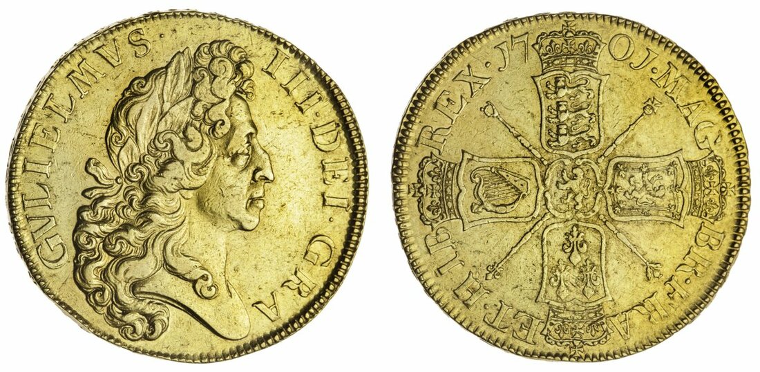 William III (1694-1702), ‘Fine Work’ Five-Guineas, 1701 DECIMO TERTIO, second laureate head right, rev. crowned shields cruciform, plain sceptres in angles, Irish harp without strings, 41.59g, 5h (Spink 3456; MCE 172; Schneider II, 480; Stratos -; EGC 398 ‘R2’), a newly classified variety according to Bull with traces of wiping in residually lustrous and bagmarked fields, nevertheless a bold very fine and affordable example of this supremely attractive series, struck under the tenure of Sir Isaac Newton