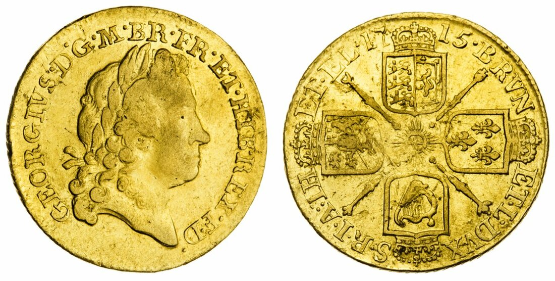 George I (1714-1727), Guinea, 1715, second laureate head, hair curl below truncation, 8.30g, 5h (Spink 3629; MCE 246; Schneider II, 545; Murdoch III, 10[a]; King -; Stratos -), wiped surfaces with some smoothing on face, otherwise residually lustrous, about very fine