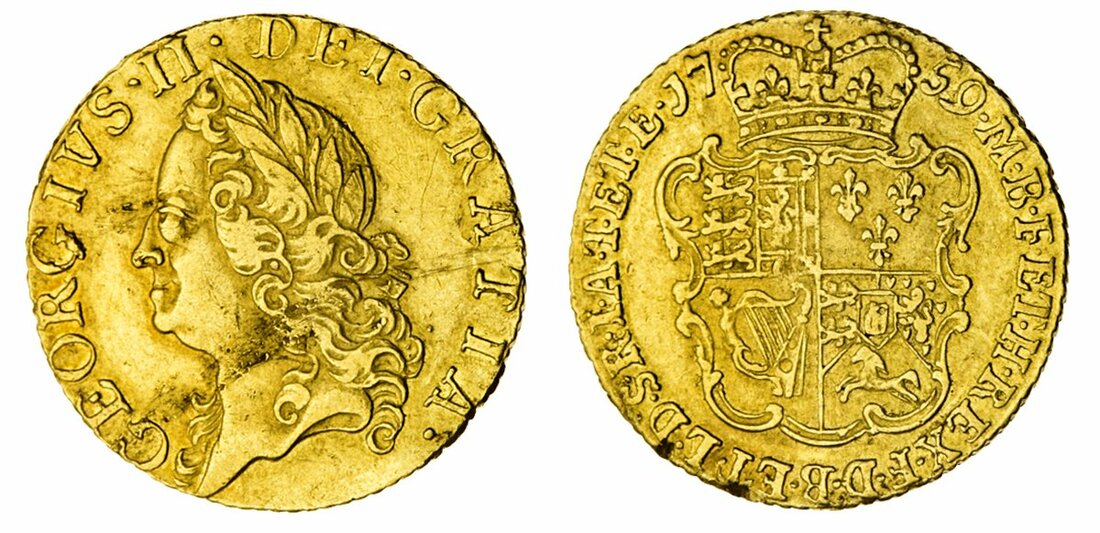 George II (1727-1760), Half-Guinea, 1759, third older laureate head, 4.16g, 6h (Spink 3685; MCE 365; Schneider II 605/-; Murdoch III, -; King - [cf. 151]; Stratos 40), scuffs and digs to flan and rims, otherwise very fine