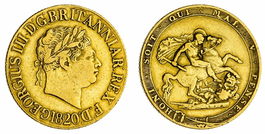 (g) George III (1760-1820), Sovereign, 1820, ‘Open 2’, large date, edge milled, 7.92g, 6h (Spink 3785C; Marsh 4; MCE 466; Murdoch III, 100[b]; King - [cf. 186]; Stratos 116), cleaned, almost very fine