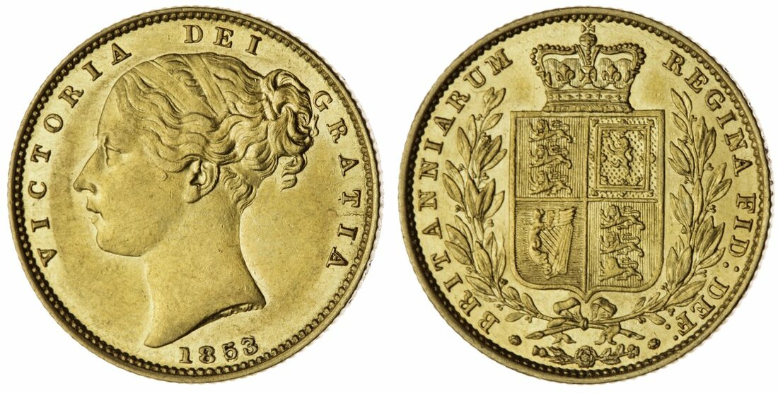 Victoria (1837-1901), Sovereign, 1853, repunched 53, W.W. buried in relief on truncation, edge milled, 7.95g, 7h (Spink 3852C; Marsh 36), a handsome coin with much mint flare, extremely fine or better