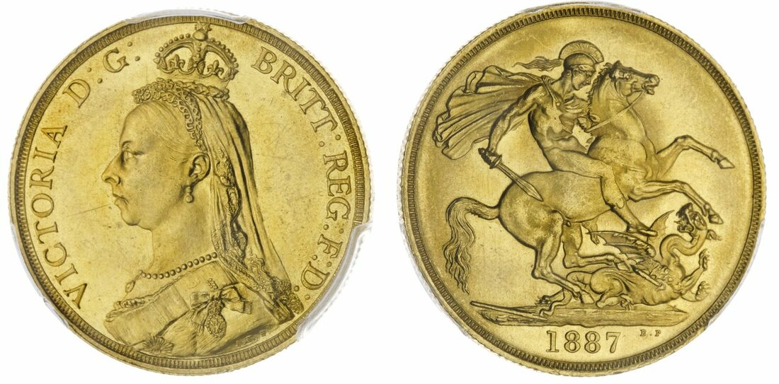 (g) MS62 | Victoria (1837-1901), Two-Pounds, 1887, 'Jubilee' head, rev. St. George and Dragon, edge milled, 12h (Spink 3865; MCE -; Stratos 173), flashy fields, good extremely fine, in PCGS holder, graded MS62 (Cert. 3819399)