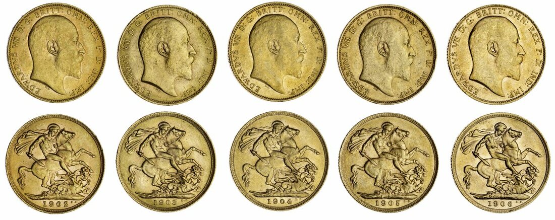 (g) Edward VII (1901-1910), Sovereigns (5), 1902; 1903; 1904; 1905; 1906 (Spink 3969), all extremely fine or better, a fine group (5)