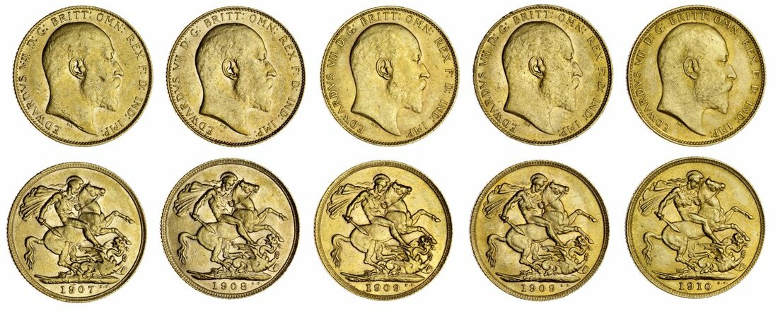 (g) Edward VII (1901-1910), Sovereigns (5), 1907; 1908; 1909 (2); 1910 (Spink 3969), all extremely fine or better (5)