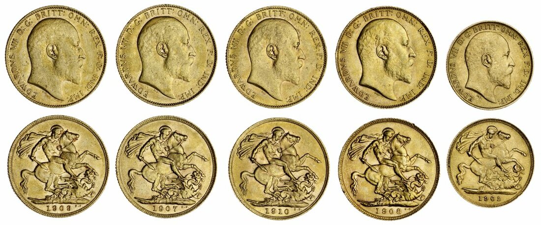 (g) Edward VII (1901-1910), Sovereigns, 1907; 1908; 1909 (2); 1910 (Spink 3969); additionally, Half-Sovereign, 1902 (Spink 3974A), all extremely fine or better (5)