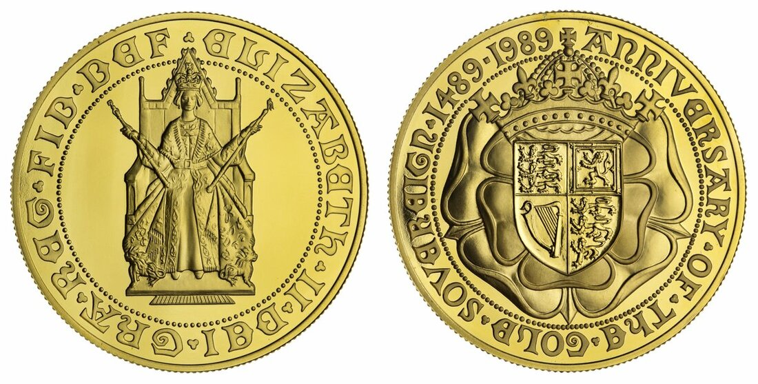 (g) PF69 ULTRA CAMEO | Elizabeth II (1952-), Proof Five-Pounds, 1989, '500th Anniversary of the Sovereign', by Sindall, Queen seated in King Edward's chair, rev. Tudor Rose, edge milled, 12h (Spink SE6), brilliant uncirculated, in holder NGC PF69 ULTRA CAMEO (Cert. #5878611-005)