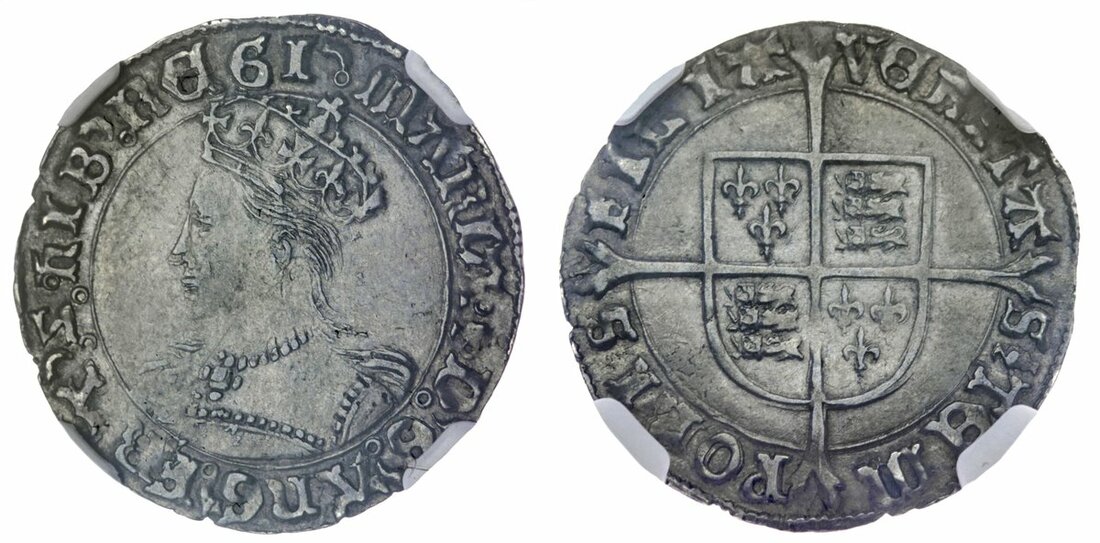 Mary I, Sole Reign (1553-1554), Groat, London mint, crowned bust left, mintmark pomegranate, 2.04g, 9h (Spink 2492; North 1960), lightly double struck on obverse, otherwise a crisp strike and a lovely toning, bold very fine, in NGC holder Extremely Fine 45, cert. #5878645-004