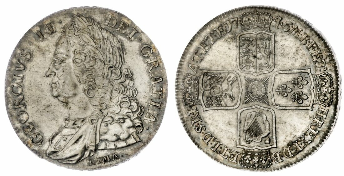 CGS 80 | George II (1727-1760), Lima Crown, 1746 DECIMO NONO, rev. ten strings to harp, angles plain, edge lettered downwards, 6h (ESC 1668 [125]; Spink 3689; Pywell-Phillips 313), some die rust in fields, otherwise lustrous, a striking extremely fine, in LCGS holder, graded CGS 80 [Reputedly equated to Sheldon MS64 / Tied 1 of 6 Finest at CGS]