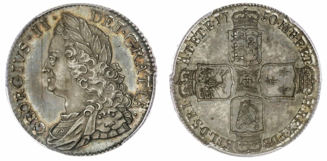 MS64 | George II (1727-1760), Halfcrown, 1750 VICESIMO QVINTO, reads GEORGIUS, rev. nine strings to harp, angles plain, edge lettered upwards, 5h (ESC 1692 [609]; Spink 3696; Pywell-Phillips 327), a breathtaking example of this key date quite equal to a proof, darker peripheral tone otherwise lustrous, much as struck, very rare in this state, in PCGS holder, graded MS64 (Cert. 80712866) [Tied 1 of 3 / 4 Finer]