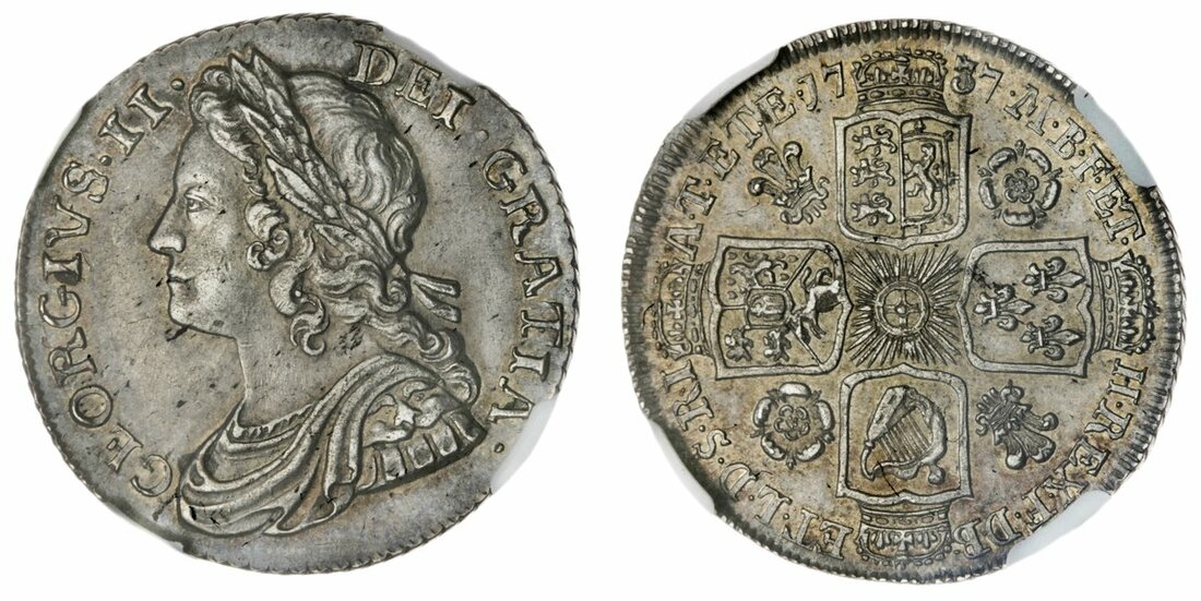 MS62 | George II (1727-1760), Shilling, 1737, rev. eight strings to harp, roses and plumes in angles, edge obliquely milled, 7h (ESC 1711 [1200]; S.3700), lightly toned, otherwise uniformly and handsomely struck up, a pleasing extremely fine, in NGC holder, graded MS62 (Cert. #5878613-009) [Tied 1 of 2 / 4 Finer]