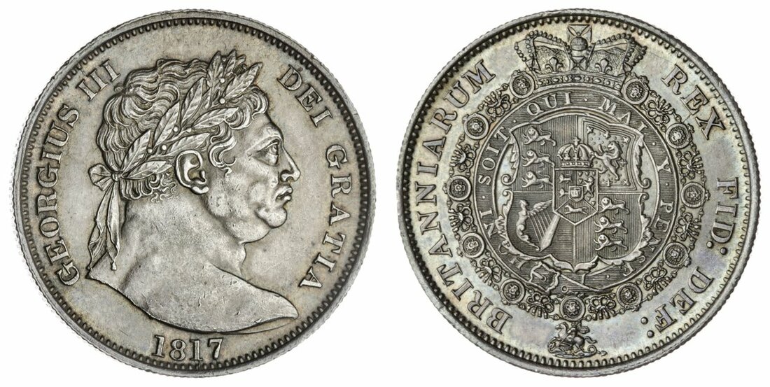 George III (1760-1820), Halfcrown, 1817, Type 1, edge milled, 14.14g, 12h (Spink 3788; ESC 2090 [616]; Pywell-Phillips - [cf. 479]), a few pecks on shoulder, attractive cabinet tone overlying lustrous mint surfaces, otherwise good extremely fine