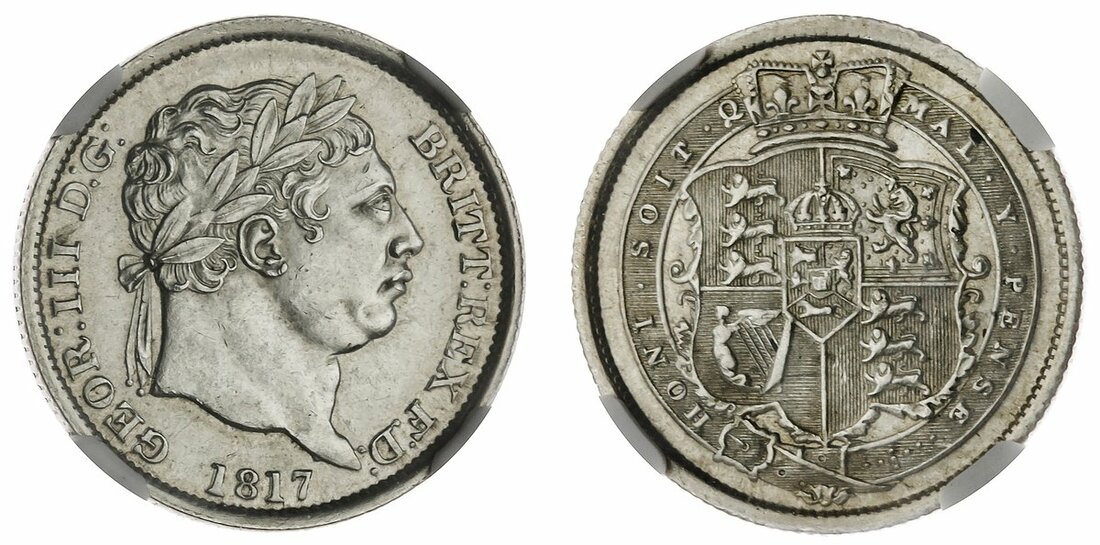 MS63 | George III (1760-1820), Shilling, 1817, edge milled, 5.62g, 12h (ESC 2144 [1232]; S.3790), lustrous, much as struck, in NGC holder, graded MS63