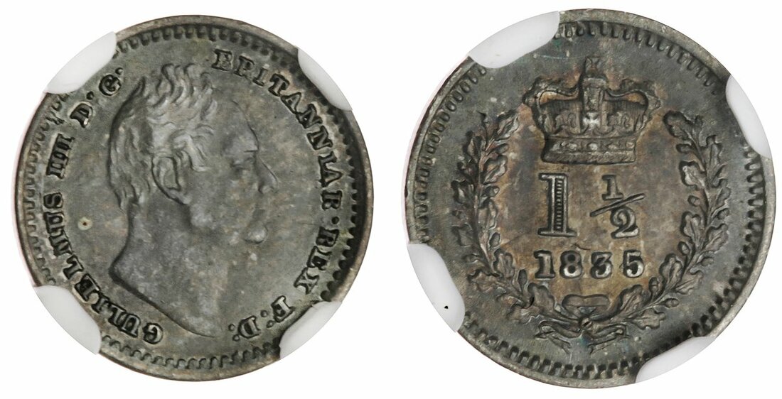 AU55 | William IV (1830-1837), Threehalfpence, 1835 over 4, edge plain, 5h (ESC 2542 [2251A]; S.3839), some superficial marks, otherwise toned, a bolder extremely fine, in NGC holder, graded AU55 (Cert. #5878613-004) [Tied 1 of 2 / 12 Finer]