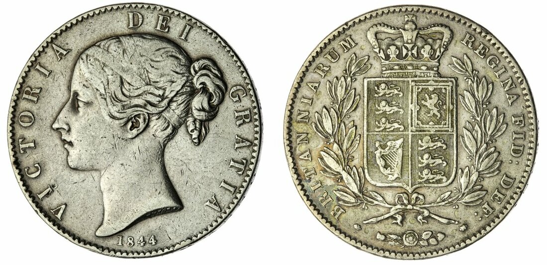 Victoria (1837-1901), Crown, 1844, VIII, young head left, rev. crowned shields within wreath, eight strings to harp, cinquefoil stops on lettered edge upwards, 28.06g, 6h (Spink 3882; ESC 2562 [281]), polished with rim stipling, fine