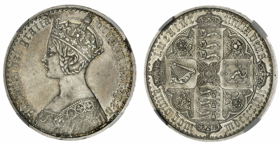 PROOF DETAILS | Victoria (1837-1901), 'Gothic' Crown, 1847 UNDECIMO, 'Gothic' bust left, rev. crowned shields cruciform, national emblems in angles, edge lettered downwards, 28.28g, 6h (Spink 3883; ESC 2571 [288]), edge damage at 2 o'clock where removed from mount, and surface marks to residually brilliant fields, otherwise a really bold very fine, and solidly collectable example of this 'Darling of English Numismatics', in NGC holder, graded Proof Details ~ Removed from Jewellery (Cert. #5878652-001)