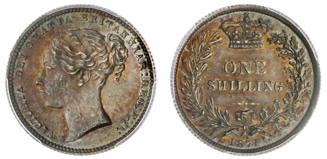 MS63 | Victoria (1837-1901), Shilling, 1871, die number 13, edge milled, 7h (ESC 2751; Spink 3906A), slight die flawing on neck, otherwise handsomely toned and lustrous, good extremely fine, in PCGS holder, graded MS63 (Cert. 34489417)