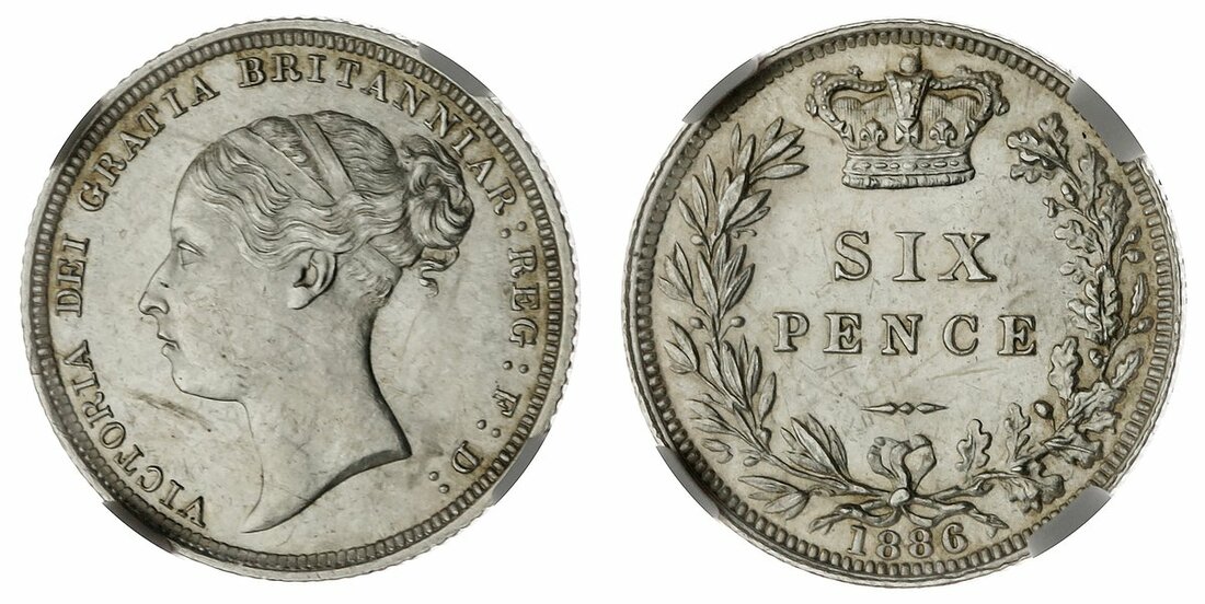 MS63+ | Victoria (1837-1901), Sixpence, 1886, type A5, second head, no initials on truncation, edge milled, 2.82g, 7h (ESC 3260 [1748]; Pywell-Phillips 669[a]), the odd bagmark, otherwise choice, near mint state, in NGC holder, graded MS63+