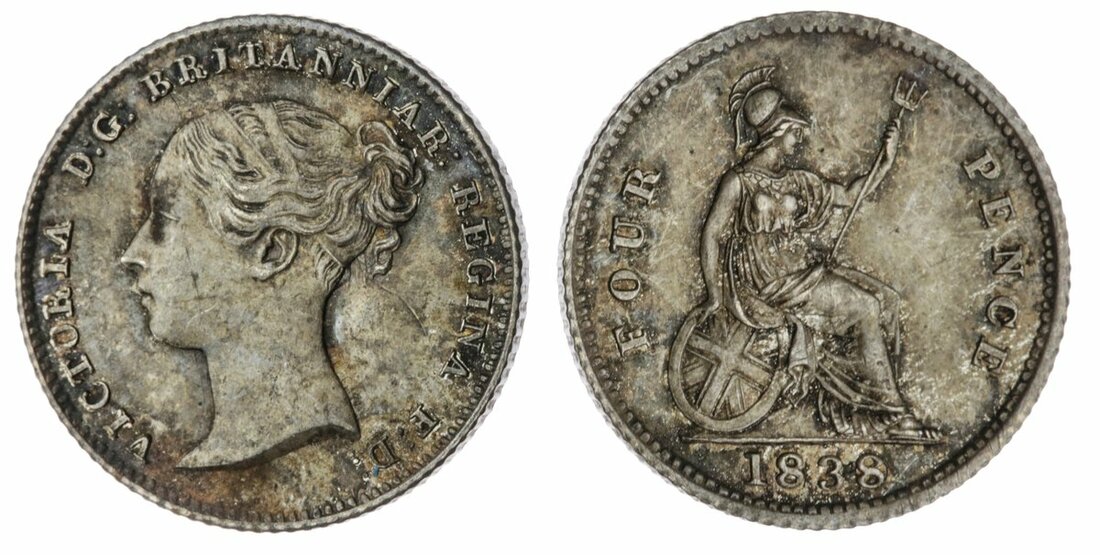 Victoria (1837-1901), Britannia Fourpence or Groat, 1838 over sideways 8, edge milled, 12h (Spink 3913; ESC 3322 [1931A]), mottled olive toning overlying lustrous surfaces, good extremely fine, scarce