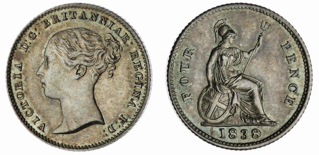 Victoria (1837-1901), Britannia Fourpence or Groat, 1838 over sideways 8, edge milled, 12h (Spink 3913; ESC 3322 [1931A]), light cabinet tone overlying lustrous surfaces, good extremely fine, scarce