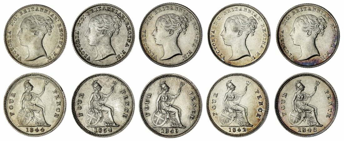 Victoria (1837-1901), Britannia Fourpence or Groats (4), 1842; 1844, large 44; 1848; 1849, 9 over 9; 1854 (Spink 3913), generally cleaned, otherwise lustrous, about extremely fine (5)