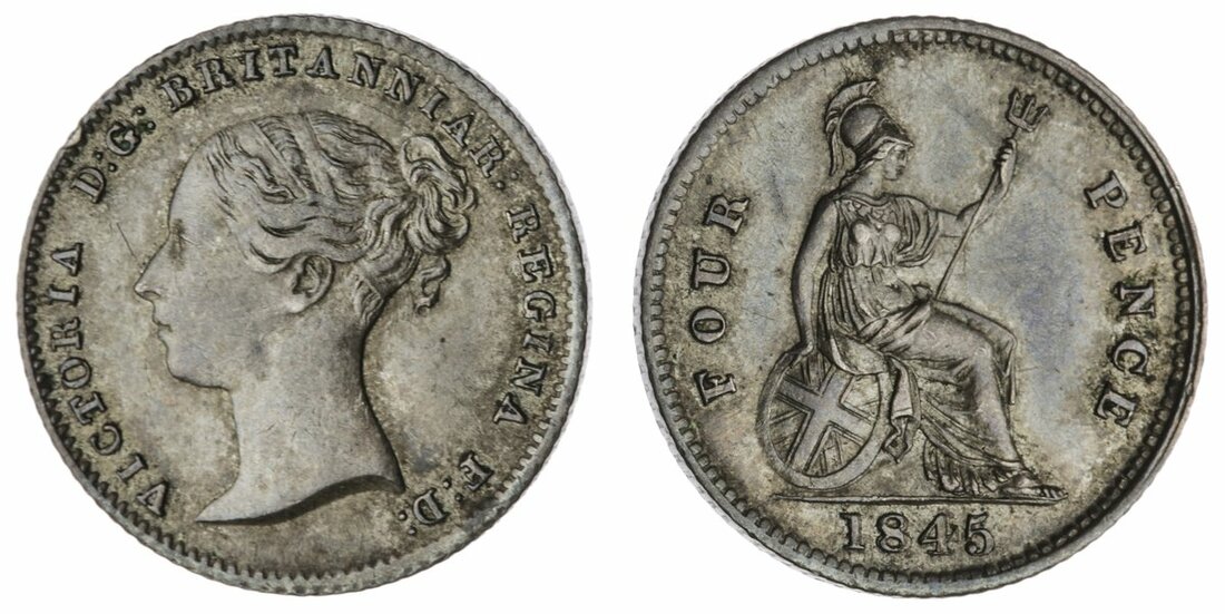 Victoria (1837-1901), Britannia Fourpence or Groat, 1845, edge milled, 12h (Spink 3913; ESC 3337 [1940]), toned, extremely fine