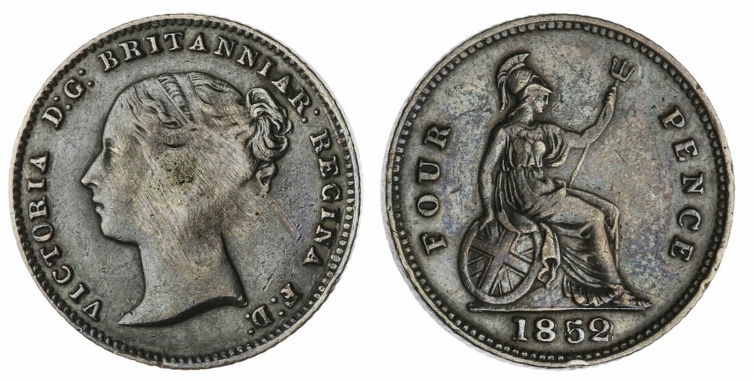 Victoria (1837-1901), Britannia Fourpence or Groat, 1852, the date repunched, edge milled, 12h (Spink 3913; ESC 3346 [R3] [1948]), removed from a cufflink with smoothing to portrait, otherwise toned, the key date of series, very fine details