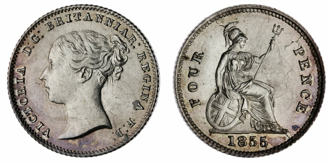 Victoria (1837-1901), Britannia Fourpence or Groat, 1855, N over small N in PENCE, edge milled, 12h (Spink 3913; ESC 3352 [1953]), flashy fields, much as struck