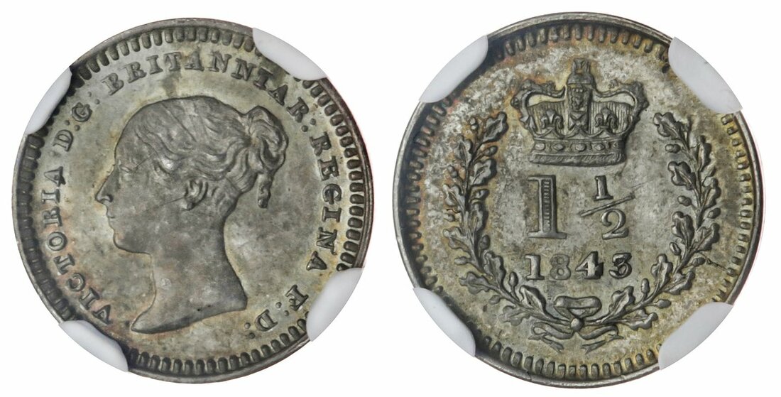 MS65 | Victoria (1837-1901), Threehalfpence, 1843, edge plain, 6h (ESC 3468 [2259]; S.3915), the 8 of date softly struck and other numbers resunk, cabinet tone overlying lustrous surfaces, a pleasingly coin, almost as struck, in NGC holder, graded MS65 (Cert. #5878613-003) [Tied 1 of 7 / 2 Finer]