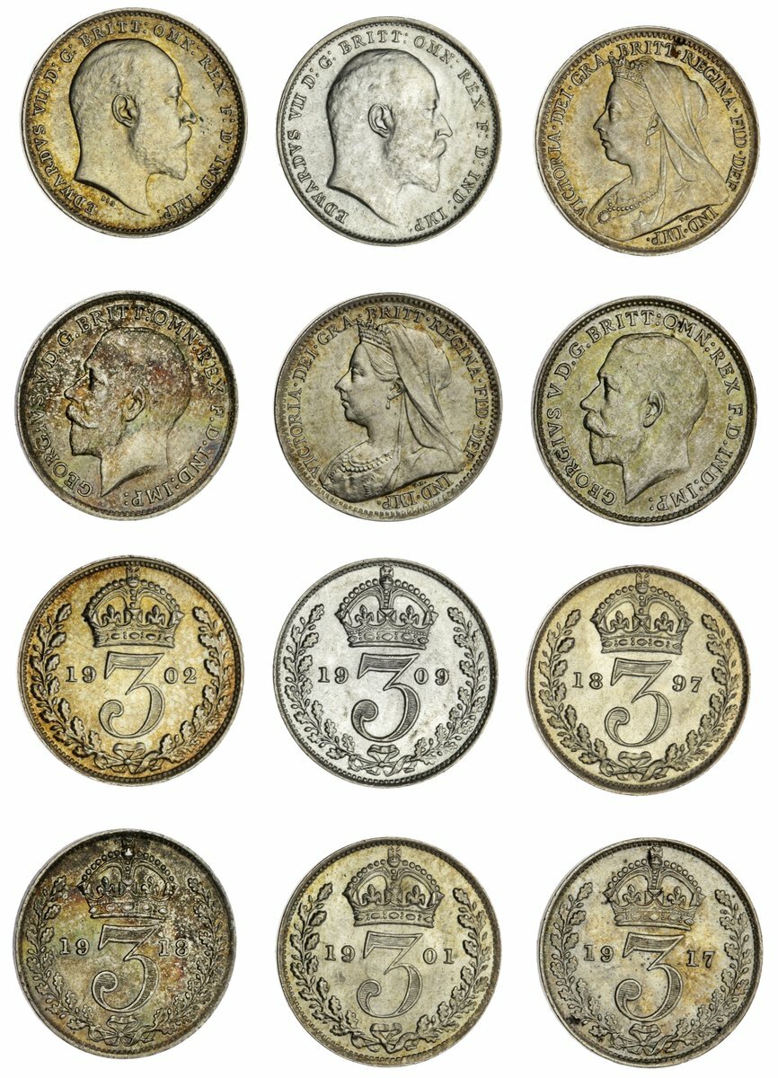 Victoria - George V, a group of six Three-pences, 1897, 1901, 1902, 1909, 1917, 1918 (Spink 3942, 3984, 4015), 1897-1909 uncirculated or better, 1917, 1918 about uncirculated.(6)