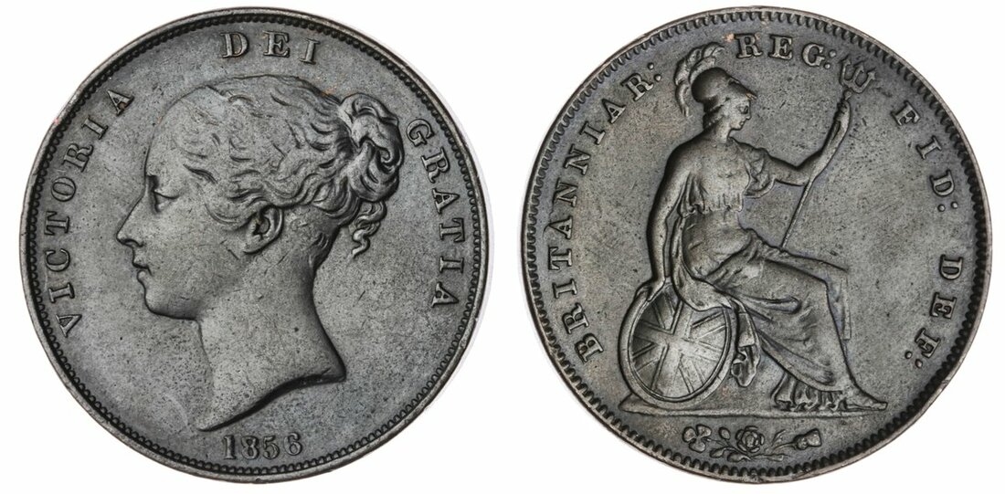 Victoria (1837-1901), Penny, 1856, young head left, rev. Britannia seated right, holding plain trident (Spink 3948; BMC 1510), about extremely fine, soft strike and light wear on high points, untouched, dusty surfaces, rare