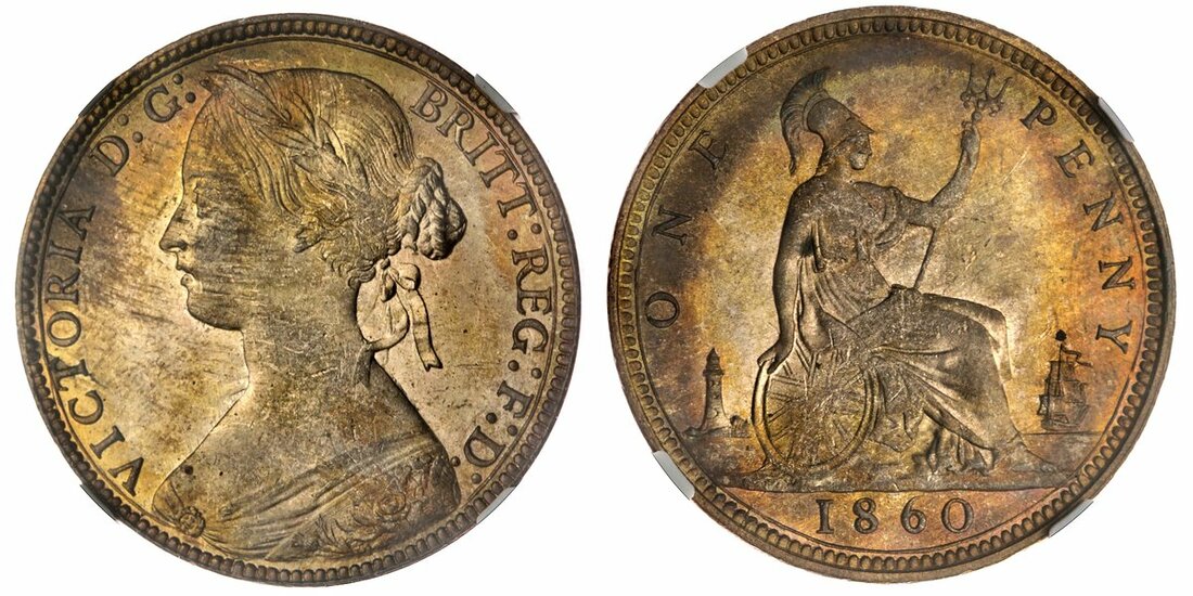 Victoria (1837-1901), Penny, 1860, toothed borders, young bust l., rev. Britannia std. r., with shield and trident (S.3954; Freeman 10; Peck 1625), in NGC holder Mint State 65 Red Brown, cert. #4462491-001