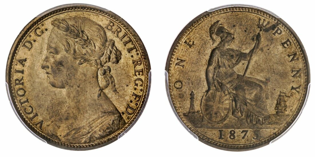 MS64 RB | Victoria (1837-1901), Penny, 1875, dies Lk, 1h (Gouby C; Bamford 93; Freeman 82 [8+J]; Peck 1703; Spink 3954), some hints of patination on highest points, otherwise lustrous, much as struck, in PCGS holder, graded MS64 RB (Cert. 39494330)