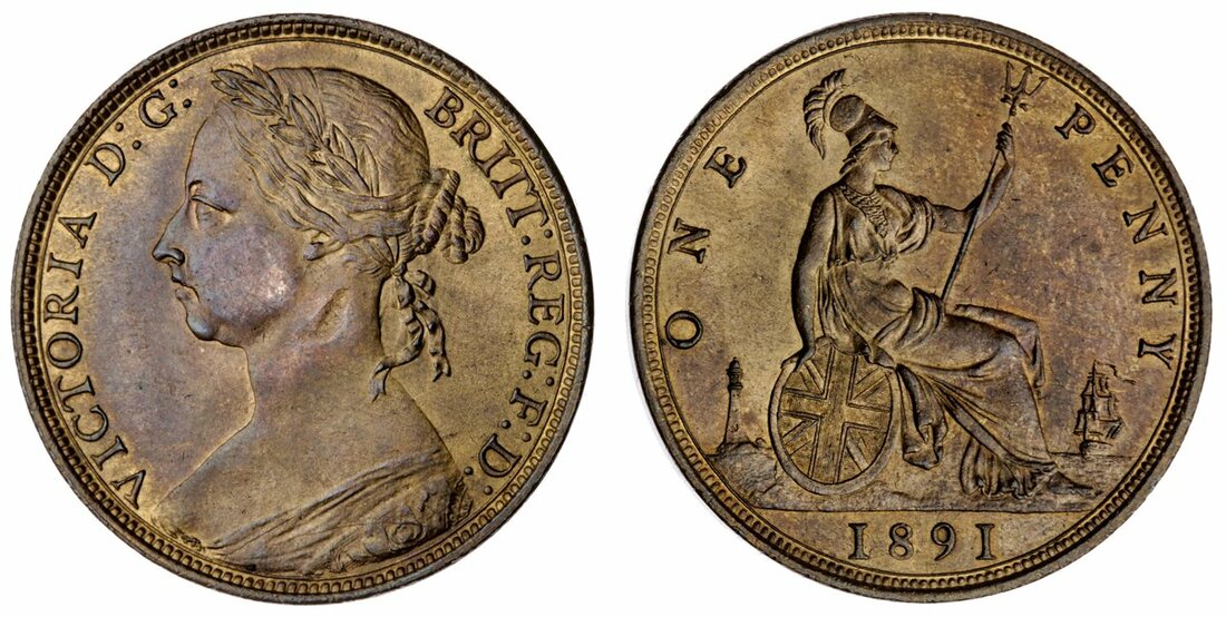 Victoria (1837-1901), Penny, 1891, young bust l., rev. Britannia std. r., with shield and trident (S.3954; Freeman 132; Peck 1744), flan flaw on obverse neck and Britannia's knee, uncirculated and lustrous