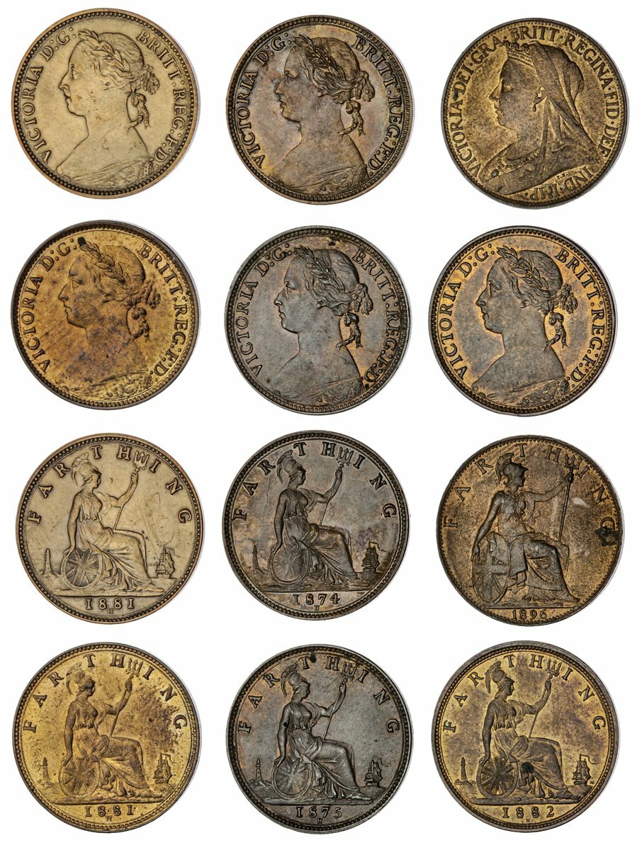 Victoria (1837-1901), a group of five Heaton Mint Farthings, 1874, 1875, 1881(2), 1882 (Spink 3959; Freeman 525, 532, 548, 549), one 188, cleaned, good very fine, the others uncirculated or near so; with Farthing, 1896 (Spink 3963; Freeman 572), about uncirculated). (6)