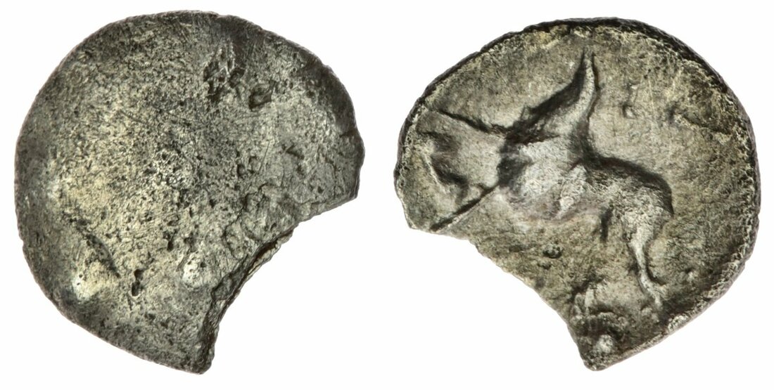 Iceni, Ecen (c. AD 10-43), AR Half-Unit, practically uniface, the back-to-back crescents obliterated, rev. sinous horse left, Y-motif above, [ECE] below, 0.39g (VA -; BMC -; Spink -; ABC 1696), chipped, otherwise of good fabric, very fine, extremely rare