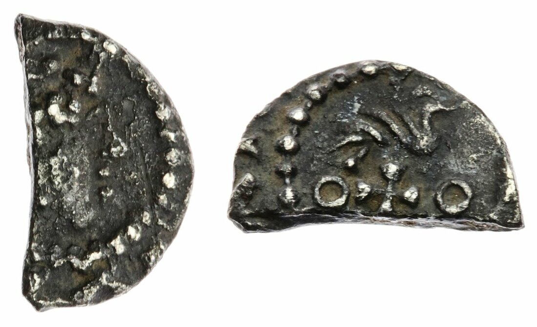 Anglo-Saxon England, Primary Phase (c. 680-710), Series BIA/C, Sceat, diademed bust right, vestigal legends surround, rev. bird atop cross on steps, flanked by annulets, 1.22g, 11h (BMC Type 27b; Abramson 56; North 126; Spink 777), cut in half as 'hack', otherwise toned, about very fine