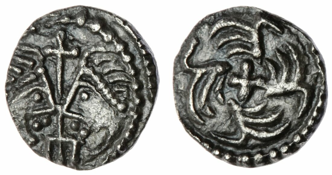 (x) Anglo-Saxon England, Secondary Series (710-760), Series J, Sceat, Type 37, 'York', diademed heads facing, with braided hair, long cross on pedestal between, double beaded border, rev. whorl of four linear birds forming clockwise cross around central cross pommée, 0.81g, 10h (Abramson 386-387; North 134; Spink 802A), the reverse a touch off-struck, otherwise lightly toned, a bolder very fine
