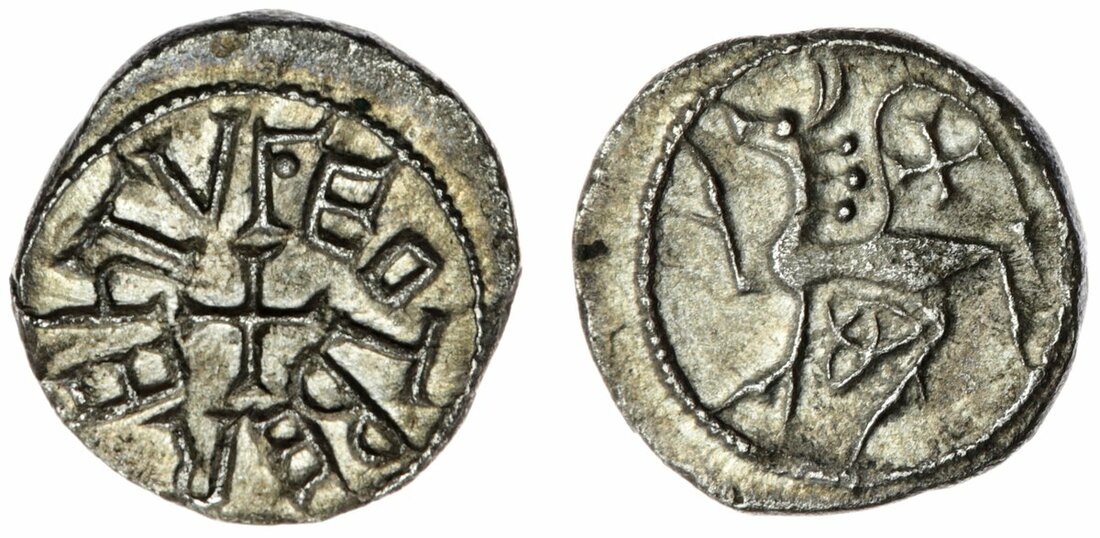 (x) Northumbria, Eadberht (738-758), Series Y, Sceat, Class Di, 'Fantastic Beasts', EAdBERhTVF· around cross pattée, rev. quadruped left, triskele below, cross above, 0.98g, 9h (Abramson 841-843; North 178; Spink 847), a lovely example, a really good very fine