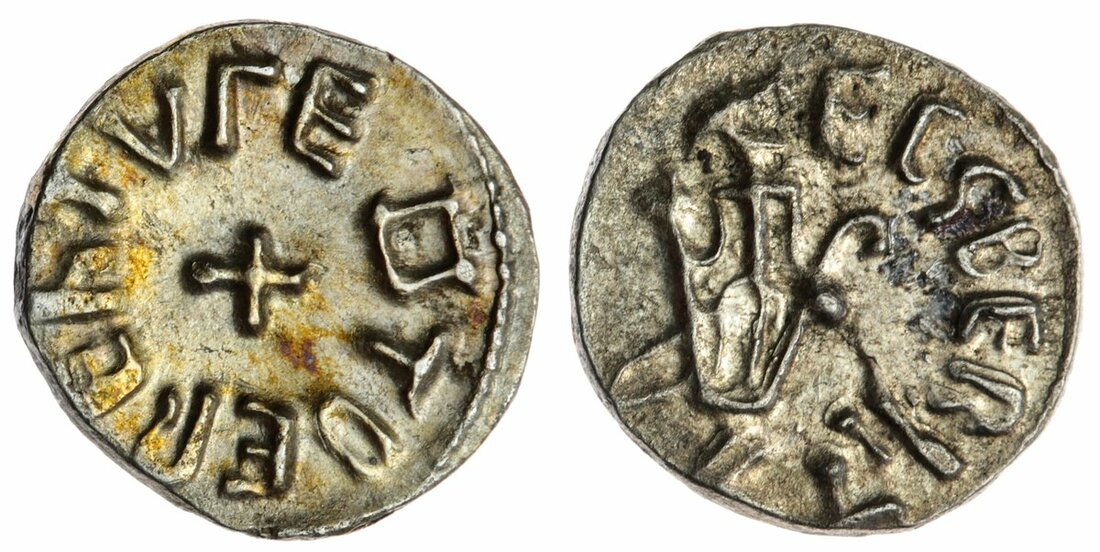 (x) Northumbria, Eadberht, with Archbishop Ecgberht (738-757), Sceat, Variety I, EDTBEREhTVl·, around cross pattée, rev. ECGBERhT A, mitred ¾-length Archbishop Ecgberht standing facing, holding two long crooks on uneven ground, 0.98g, 4h (Bude 2016, pl. 10, nos. 2 & 11; Abramson 1027ff; North 192; Spink 852), bright and lustrous, good very fine