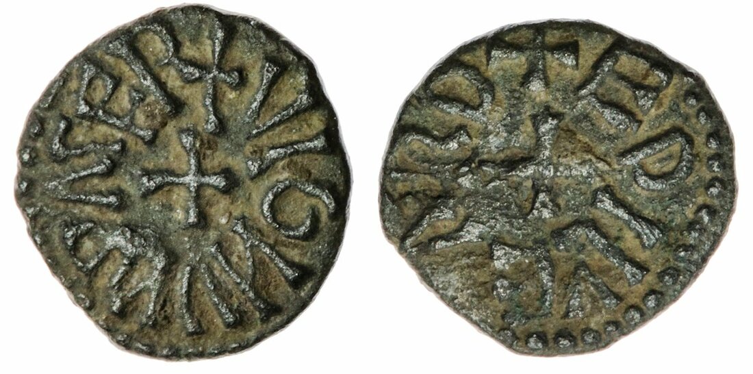 (x) Northumbria, Archbishop Wigmund (c. 837-849/50), Styca, Phase IIc, Edilweard, +VIGMVND AREP, rev. +EPILVEARD retrograde, 0.95g, 9h (Abramson 1054-1056; North 196; Spink 870), deposits in recesses, otherwise about very fine