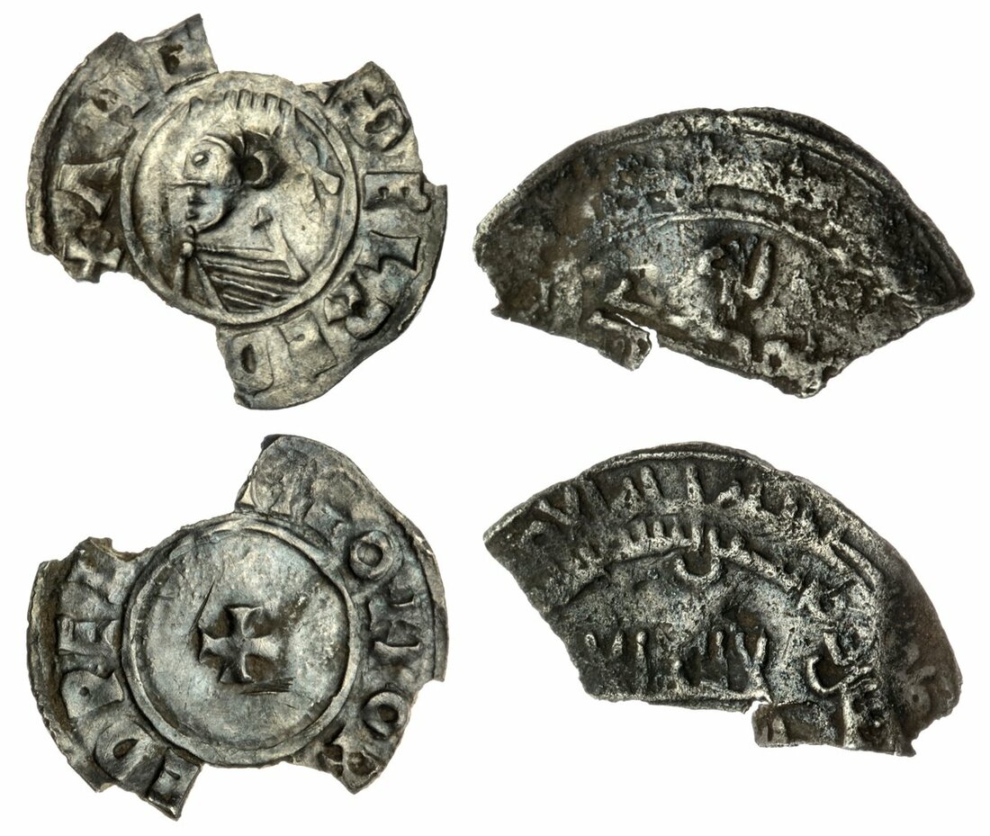 Aethelred II (978-1016), Last Small Cross, Penny, Northampton or Norwich , Eadweard, rev. [+] EDPER[D....] M-O NOR[....], 0.72g, 12h (North 777; BMC I; Spink 1154); heavily chipped, otherwise stable and of good fabric, very fine details; additionally a piece of Viking 'Hack' Silver, an Abbasid Dirham, AH270 or AH290 [c. 883-903), 0.78g, chipped and hacked, a smaller fragment, only about fine, but of historical interest nonetheless (2)