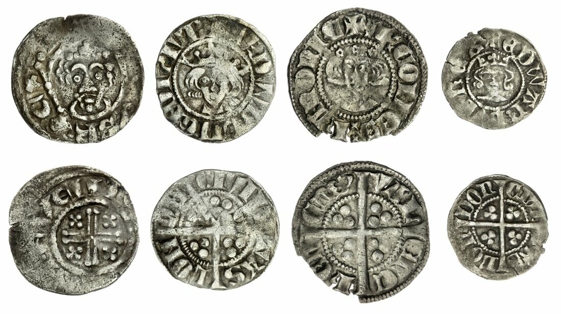13th-14th Century, Pennies and Halfpennies (4), including, Richard I (1189-1199), Short Cross Penny, Class IVa, York, Turkil, rev. T[VRKIL O]N EVEI, 1.31g, 3h (SCBI Mass 1015; Spink 1348A), crimped and off-struck, otherwise a bold fine; additionally, 'Edward I, a Contemporary Forgery, Long Cross Penny, in the style of London, 1.07g, 9h, double struck in rotated dies on reverse, otherwise about fine; another, Counts of Hainault, Jean d'Avesnes (1280-1304), Esterling, Valencienne, 1.22g, 10h (Mayhew 35), ragged low edge and slightly concave, otherwise good fine; lastly, Edward III (1327-1377), Third 'Florin' Coinage, Halfpenny, London, 0.57g, 9h (Spink 1557), slightly ragged and waterworn, otherwise a bolder fine; a most enjoyable group! (4)