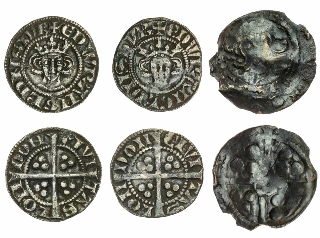 Edward I (1272-1307), New Coinage, Halfpennies, London (2), Class 3c, drapery composed of two wedges, 0.66g, 9h (Spink 1432), slightly porous, otherwise almost very fine, scarce; another, Class 3g, egg-waisted S, 0.76g, 8h (Spink 1433), good fine; lastly, a Contemporary Forgery Penny, in the style of York or Durham , rev. quatrefoil at centre, 0.79g, 11h, heavily crimped and darkly toned, fair, most curious (3)