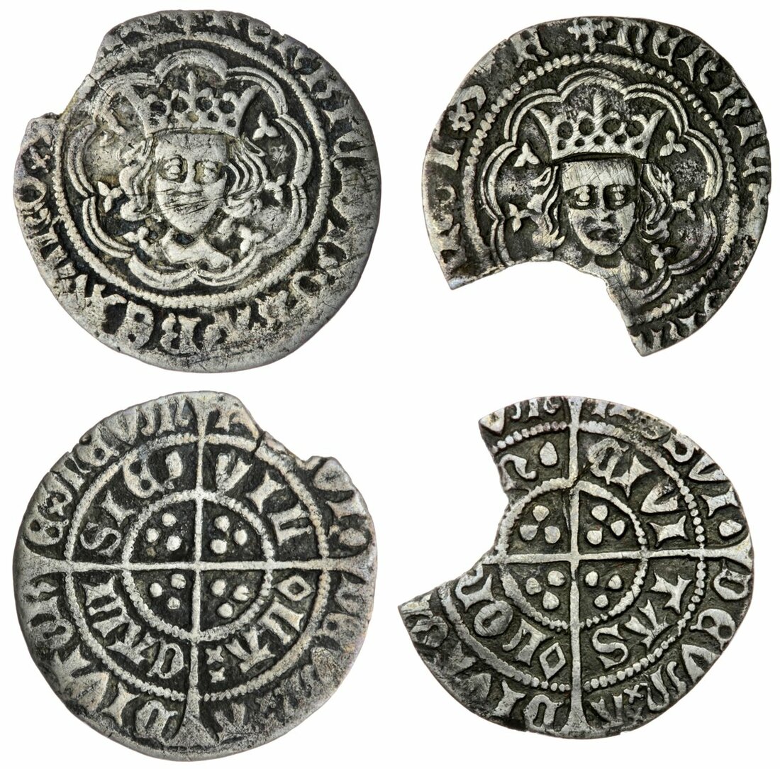 The Abramson Collection of English Coins | Henry VI, First Reign (1422-1461), Half-Groats, Calais (2), Rosette-Mascle/Pinecone-Mascle Mule, 1.41g, 8h, m.m. cross fleury (Spink 1862/1877), chipped, a large fragment, fine; another, Pinecone-Mascle Issue, 1.60g, 2h (Spink 1877), chipped and waterworn, otherwise a bolder fine (2)