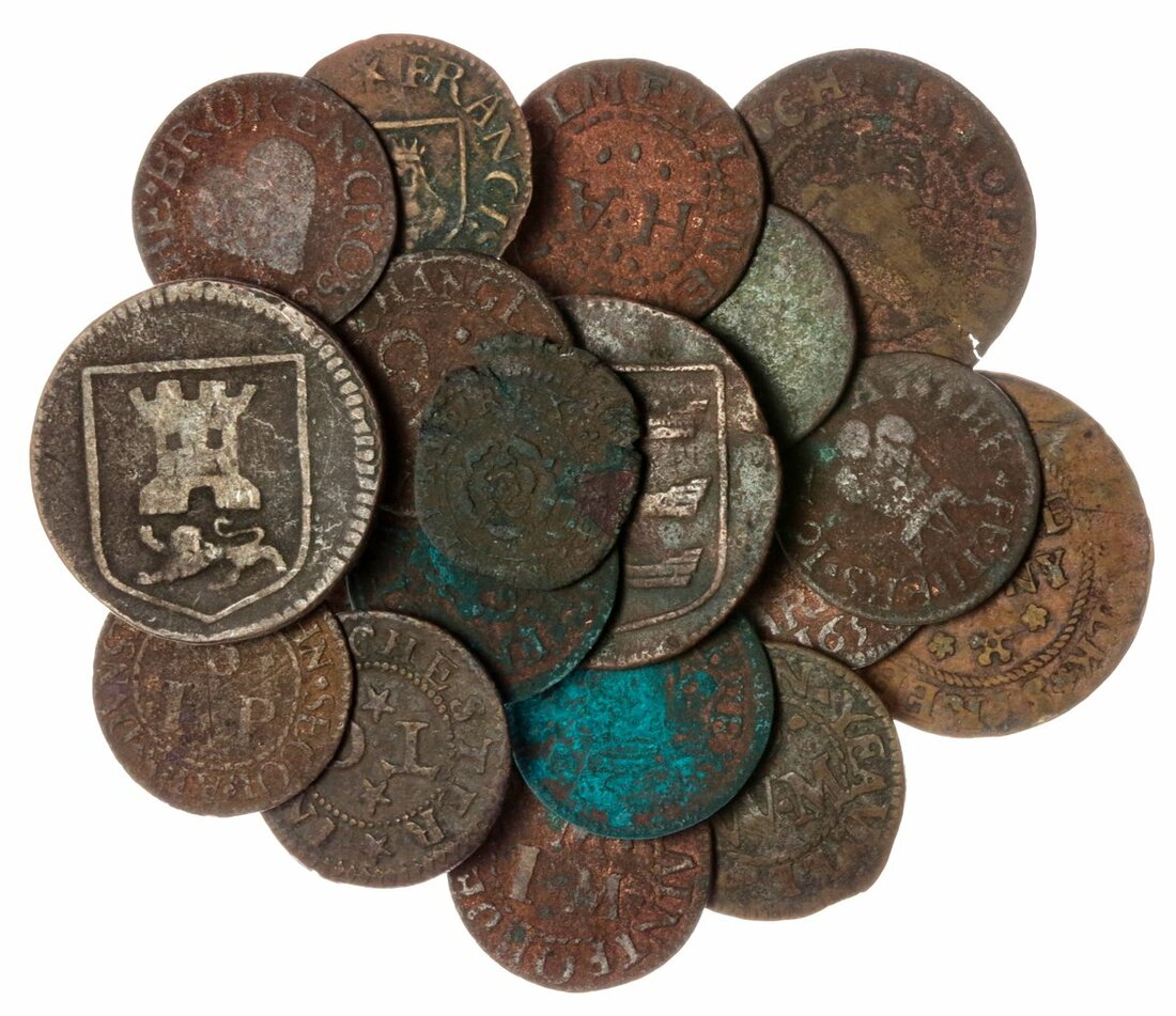17th Century Market Tokens (19), including, Norwich Farthings (2), 1667; 1670; and: Braintford, John Moor, 1651; Colchester, Thomas Carter, 1667; The Kinges Armes, Fullham, 1656 [sic]; Faversham, Francis Waters and others (13), variable grades, poor to very fine, most illegible (19)